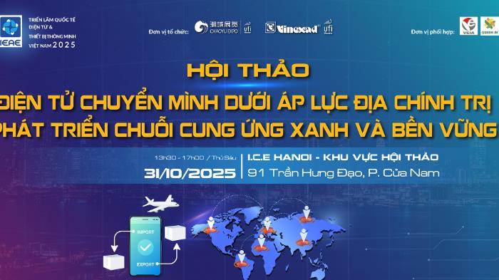 Vietnet24h - Trong khuôn khổ Triển lãm Quốc tế Điện tử và Thiết bị Thông minh Việt Nam 2025 (IEAE Hanoi 2025), Hiệp hội Doanh nghiệp Điện tử Việt Nam (VEIA) phối hợp cùng VINEXAD và GREEN IN tổ chức hội thảo chuyên đề “Điện tử chuyển mình dưới áp lực địa chính trị: Phát triển Chuỗi cung ứng xanh và bền vững”.