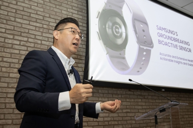 Yang Tae-jong, phó tổng giám đốc điều hành kiêm trưởng bộ phận nghiên cứu và phát triển sức khỏe thuộc đơn vị trải nghiệm di động tại Samsung Electronics, phát biểu với các phóng viên tại New York, thứ Năm, ngày 11/8/2022.
