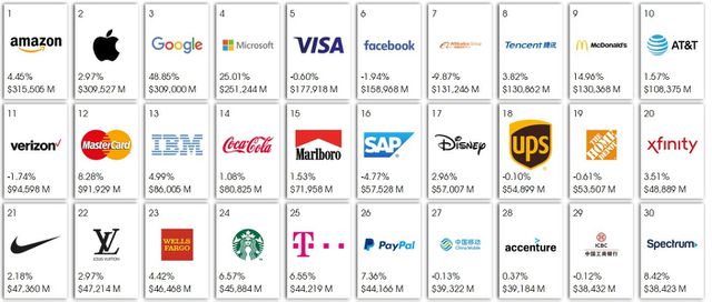Các hãng công nghệ và viễn thông tiếp tục cho thấy sức mạnh và tầm ảnh hưởng của mình khi có đến 8/10 thương hiệu giá trị lớn nhất thế giới hiện nay thuộc về các hãng công nghệ, trong đó 4 vị trí dẫn đầu đều là những hãng công nghệ lớn, bao gồm Amazon, Apple, Google, và Microsoft. Ngoài ra còn có Facebook (thứ 6), Alibaba (thứ 7), Tencent (thứ 8) và AT&T (thứ 10).