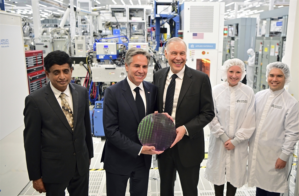 Ngoại trưởng Antony Blinken, thứ hai từ trái sang, Giám đốc điều hành Vật liệu ứng dụng Gary Dickerson, trái và Phó chủ tịch cấp cao Vật liệu ứng dụng của Tập đoàn sản phẩm bán dẫn Prab Raj, đứng giữa, chụp ảnh cùng các nhân viên tại Vật liệu ứng dụng ở Santa Clara, California, Hoa Kỳ, ngày 17/10/2022