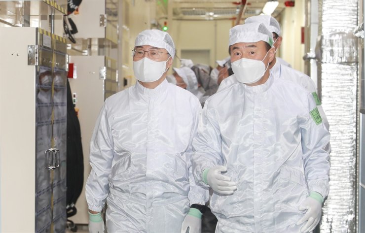 Bộ trưởng Bộ Công nghiệp Moon Sung-wook, bên trái, được Giám đốc điều hành Samsung SDI Jun Young-hyun giới thiệu ngắn gọn về cơ sở sản xuất pin của công ty ở Ulsan, thứ Hai, ngày 5 thang 7 năm 2021