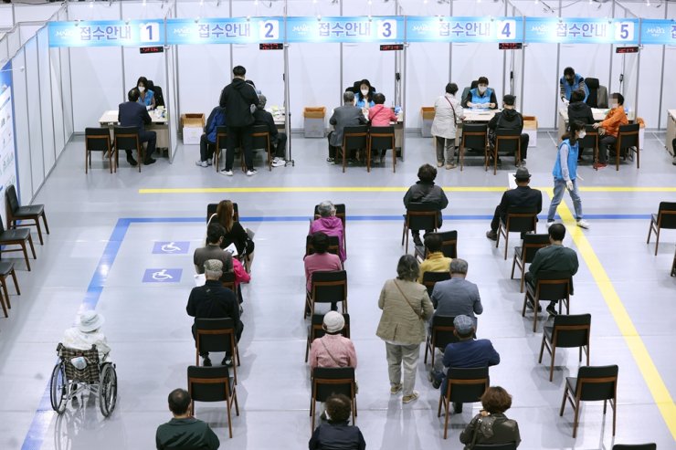 Mọi người xếp hàng chờ tiêm vắc xin phòng bệnh COVID-19 tại một trung tâm ở Seoul, ngày 3/5.