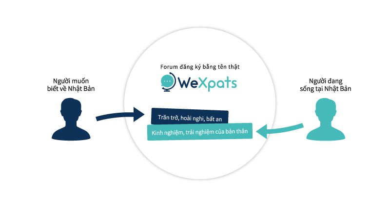Cộng đồng WeXpats là cộng đồng Q&A (Hỏi và Đáp) giải quyết các vấn đề liên quan đến cuộc sống tại Nhật Bản thông qua chia sẻ kinh nghiệm của tất cả các thành viên tham gia. Đối với những vướng mắc mà bất cứ ai cũng có thể gặp phải trong quá trình sống và làm việc tại Nhật, những người dùng đã từng trải qua có thể chia sẻ kinh nghiệm của mình để  cùng tháo gỡ những khó khăn đó. WeXpats sẽ hiện thực hóa thế giới nơi mọi người hoàn toàn có thể an tâm phát triển sự nghiệp của mình tại Nhật Bản.
