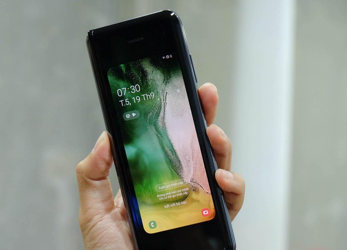 Galaxy Fold của Samsung sử dụng thiết kế “innie” (khi gập lại, màn hình chính ở bên trong). Về cơ bản, máy có hai màn hình, một màn hình Infinity Flex  kích thước lớn 7,3 inch có thể uốn dẻo và một màn hình bên ngoài kích thước 4,6 inch, có thể thoải mái sử dụng bằng một tay khi gập máy lại.