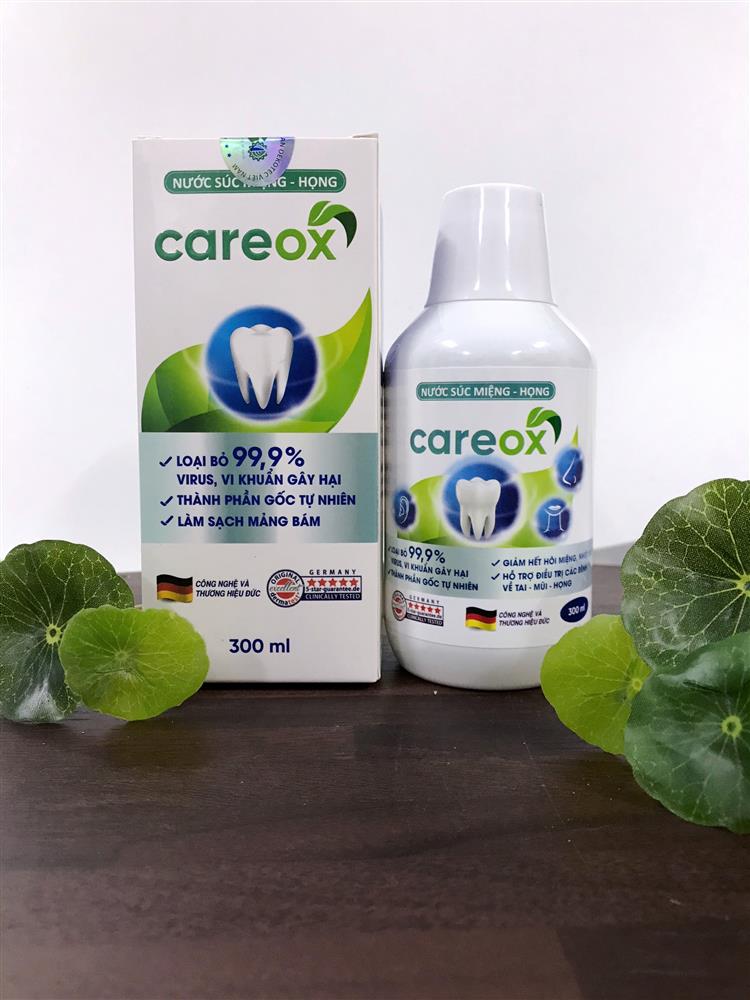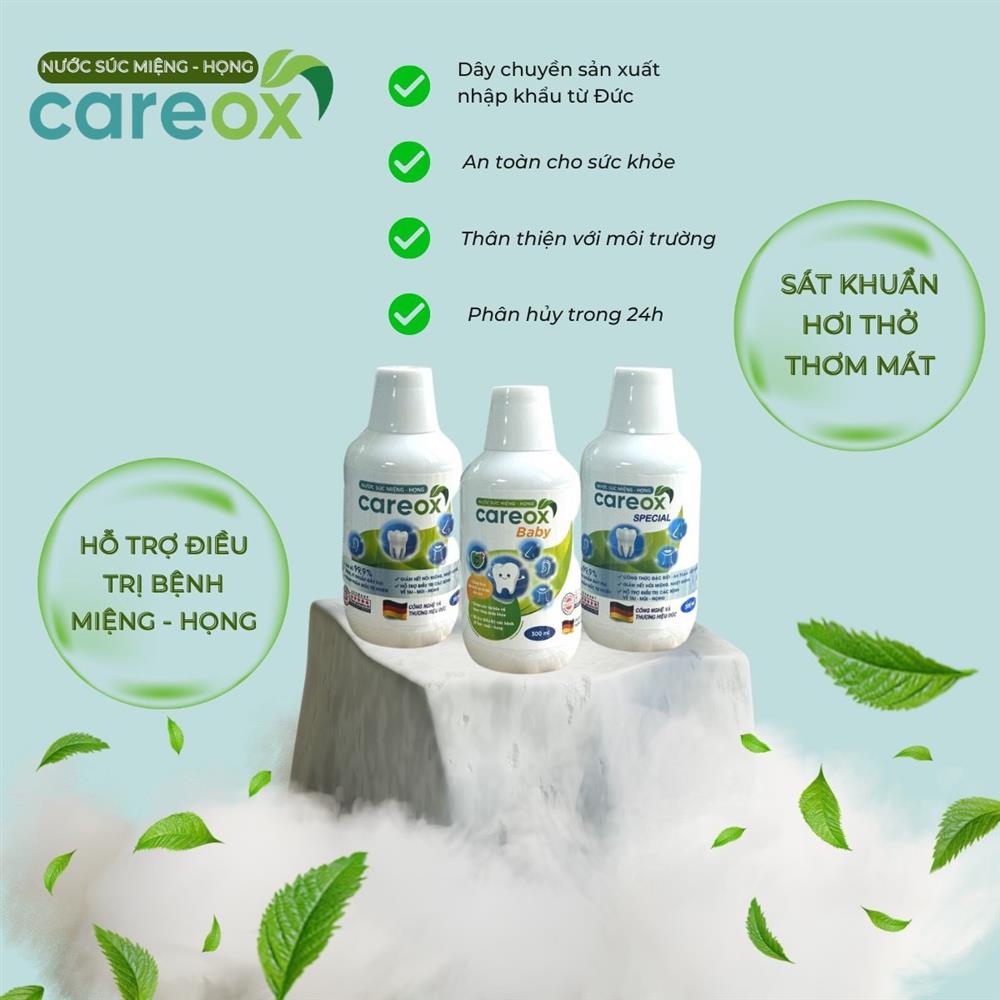 Nước súc miệng – họng Careox, sản xuất theo công nghệ hiện đại của CHLB Đức, là giải pháp an toàn và hiệu quả để bảo vệ và chăm sóc sức khỏe răng miệng toàn diện. Sản phẩm giúp làm sạch khoang miệng và hầu họng, loại bỏ 99,9% vi khuẩn và 87% mảng bám trên răng. Careox chứa nước khử điện phân tự nhiên, có khả năng diệt khuẩn và ngăn ngừa sự phát triển của vi khuẩn, virus, nấm trong niêm mạc họng.