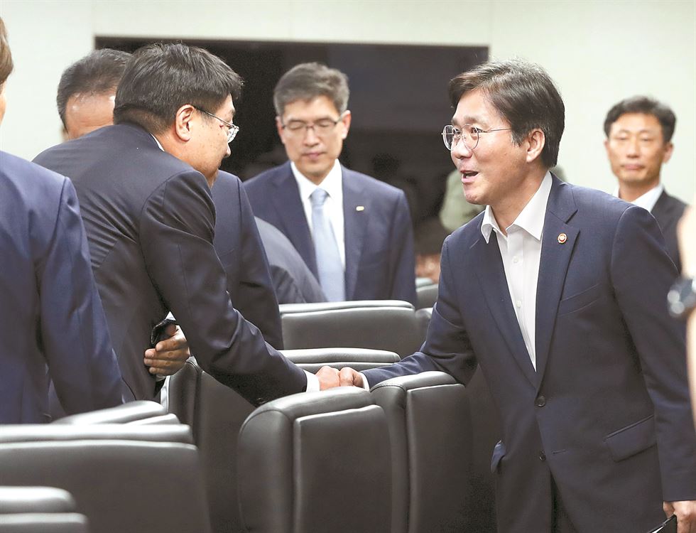 Bộ trưởng Bộ Thương mại, Công nghiệp và Năng lượng Sung Yun-mo, phải, bắt tay với Chun Se-won, phó chủ tịch điều hành của nhóm tiếp thị chip nhớ tại Samsung Electronics, trước cuộc họp tại văn phòng của Tập đoàn Bảo hiểm Thương mại Hàn Quốc ở trung tâm Seoul, thứ hai, để kiểm tra việc cung cấp nguyên liệu thô cho chất dẫn điện. Ông cho biết chính phủ sẽ đệ đơn khiếu nại lên Tổ chức Thương mại Thế giới chống lại Nhật Bản về việc áp dụng các quy định cứng rắn hơn đối với việc xuất khẩu vật liệu công nghệ cao được sử dụng trong sản xuất chip. Ảnh: Yonhap