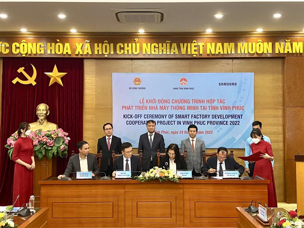 Lễ ký kết Thỏa thuận hỗ trợ cho các doanh nghiệp tham gia dự án Nhà máy thông minh giữa: Bộ Công thương, Samsung Việt Nam, Sở KHĐT tỉnh Vĩnh Phúc và các doanh nghiệp tình Vĩnh Phúc (DM VINA và ACCURACY), tại UBND Tỉnh Vĩnh Phúc ngày 24/5/2022.