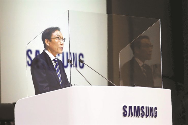 Kim Ki-nam, phó chủ tịch và giám đốc điều hành của bộ phận giải pháp thiết bị của Samsung Electronics, phát biểu trong cuộc họp thường niên của công ty tại Suwon, thứ Tư. Ảnh: Yonhap