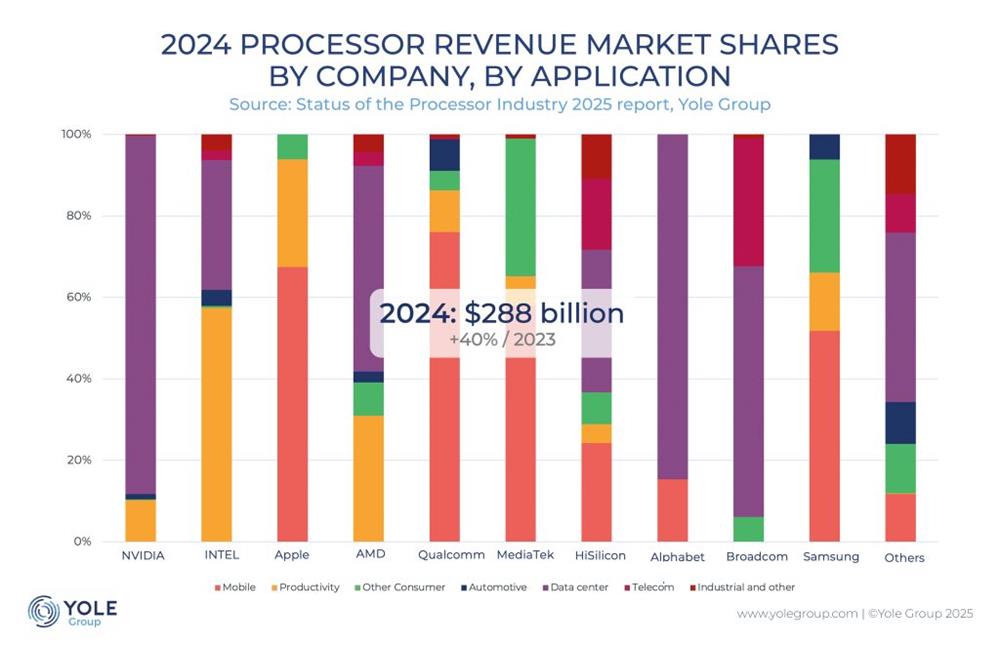 Nvidia, Intel và AMD kiểm soát 97% thị trường CPU & GPU (chiếm 58% tổng doanh thu), nhưng Arm-based và các giải pháp từ hyperscaler đang thách thức. Apple, Qualcomm và MediaTek dẫn dắt APU. Tại Trung Quốc, Huawei, Cambricon và Biren đang phát triển mạnh mẽ với kiến trúc RISC-V, được hỗ trợ bởi chính sách nội địa hóa để đối phó hạn chế xuất khẩu của Mỹ.
