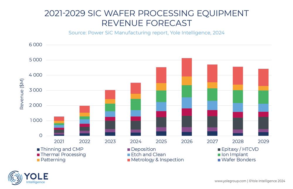 Các thiết bị như lò khuếch tán và máy oxy hóa nhiệt dự kiến sẽ tạo ra doanh thu 1,4 tỷ USD trong 5 năm tới. Các công cụ M&I (Đo lường & Kiểm tra) rất quan trọng để phát hiện các khiếm khuyết trong quá trình xử lý tấm wafer/epiwafer SiC và thiết bị, với doanh thu tích lũy dự kiến là 5,7 tỷ USD từ năm 2024 đến năm 2029.