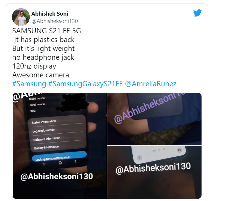 Tài khoản tweet Abhisheksoni130 cho đăng tải và tuyên bố rằng đây là Galaxy S21 FE 5G