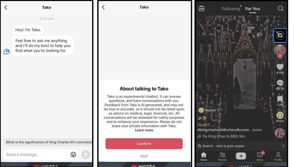 Hãng phân tích ứng dụng Watchful.ai là bên đầu tiên phát hiện TikTok đang thử nghiệm Tako. Tuy nhiên, trong khi Watchful.ai cho biết tìm thấy chatbot AI trên thiết bị iOS tại Mỹ, TikTok lại nói chatbot không được thử nghiệm ở đây mà tại các thị trường khác như Philippines.