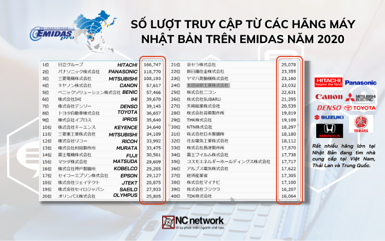 Sở hữu mạng lưới phủ rộng trên các lãnh thổ, quốc gia như Nhật Bản, Trung Quốc, Thái Lan, Mỹ, Việt Nam, EMIDAS hiện có khoảng 20.000 thông tin Doanh nghiệp trong ngành sản xuất chế tạo. Trong đó, 70% là các Doanh nghiệp Nhật Bản. Một số hãng lớn đang rất tích cực tìm kiếm nguồn cung cấp gồm có: Hitachi, Panasonic, Canon, Denso, Toyota, Suzuki, … Theo báo cáo thống kê trên giao diện Nhật năm 2020, số truy cập tìm kiếm thông tin Doanh nghiệp trên Emidas trung bình đạt 2 triệu lượt/tháng.
