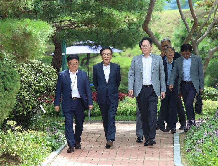 Phó chủ tịch Samsung Electronics Lee Jae-yong, phải, đi bộ với Kim Ki-nam, trung tâm, Giám đốc điều hành của bộ phận Giải pháp thiết bị của công ty và các giám đốc điều hành khác trong chuyến thăm nhà máy chip của họ ở Onyang, tỉnh Nam Chungcheong, ngày 6 tháng 8 năm 2019 Ủy ban tuân thủ của Samsung cho biết hôm thứ Năm Lee nên xin lỗi người dân vì đã nêu ra một loạt vấn đề liên quan đến sự kế thừa quản lý của nhóm. Ảnh: Samsung Electronics