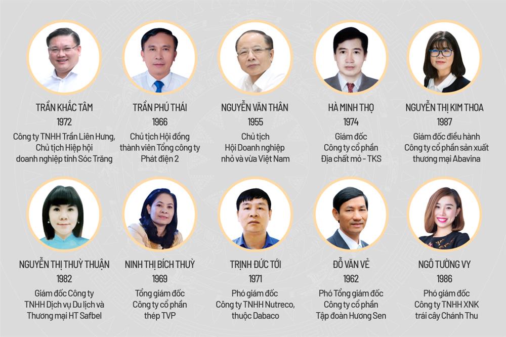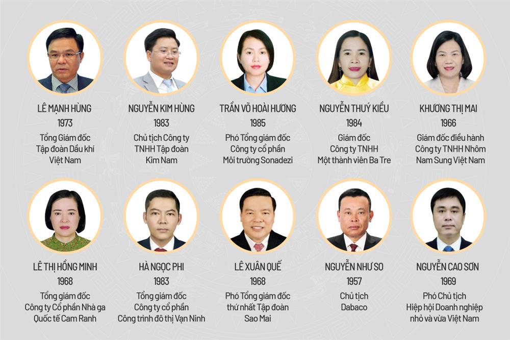 Ông Phạm Đức Ấn – Chủ tịch Ngân hàng Nông nghiệp và Phát triển Nông thôn (Agribank) là người duy nhất ứng cử tại Hà Nội; còn lại các doanh nhân chủ yếu chọn TP HCM, Bắc Ninh, Bến Tre, Đồng Nai, Quảng Ninh, Khánh Hoà và Thái Bình.