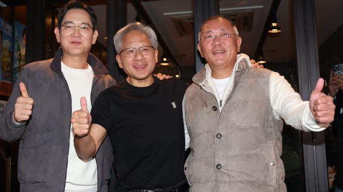 Jensen Huang của Nvidia, các giám đốc Samsung và Hyundai thân thiết với nhau về 'chimaek' Vietnet24h - Trong một màn thể hiện tình đồng chí hiếm hoi giữa những ông lớn kinh doanh toàn cầu, CEO Nvidia Jensen Huang, Chủ tịch Samsung Electronics Lee Jae-yong và Chủ tịch Điều hành Tập đoàn Hyundai Motor Chung Euisun đã cùng nhau dùng bữa tối thân mật với gà rán Hàn Quốc và bia tại Seoul vào tối thứ Năm (30/10) - một cuộc gặp gỡ thu hút sự chú ý và đông đảo người tham dự.