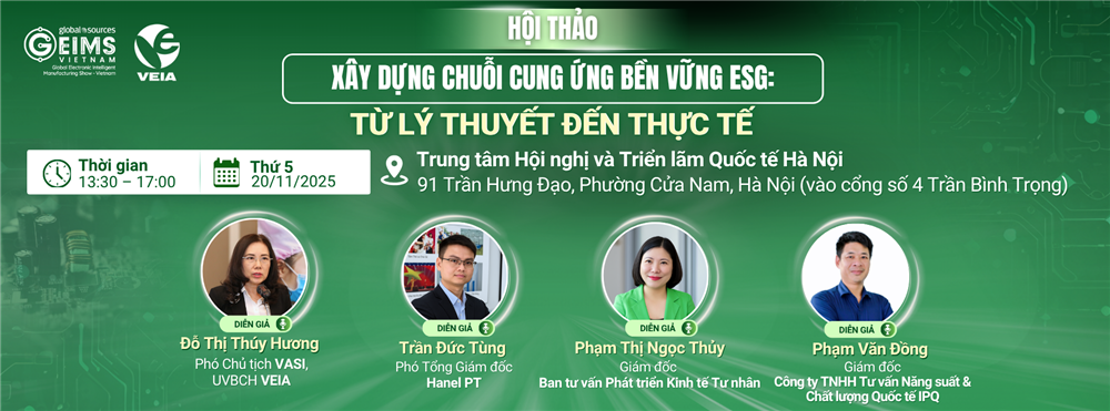 Hội thảo nhằm trang bị cho doanh nghiệp kiến thức và công cụ thực tiễn để xây dựng chuỗi cung ứng xanh, nâng cao năng lực cạnh tranh toàn cầu thông qua việc thực hành ESG (Môi trường – Xã hội – Quản trị). Các diễn giả uy tín sẽ chia sẻ: